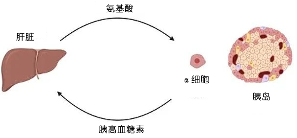 在長期禁食期間,胰高血糖素會通過上調參與氨基酸葡萄糖生成過程的酶,刺激該過程(通過葡萄糖生成)形成葡萄糖。胰高血糖素可促進氨(脫氨基過程中產生的有毒副產物)轉化為尿素,并隨尿液排出體外。因此,胰高血糖素可降低血液中的氨含量。抑制胰高血糖素受體會破壞胰高血糖素的作用,導致血漿中氨基酸水平升高和胰腺α細胞增生,進而導致胰高血糖素分泌過多。這表明,胰高血糖素和氨基酸在肝臟和胰腺α細胞之間的反饋回路中存在聯系。