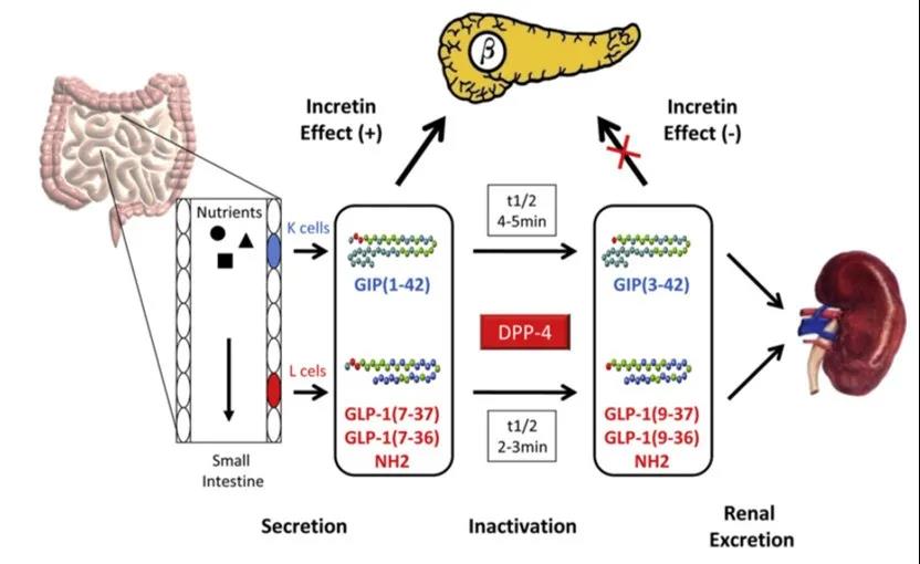 腸促胰素肽(Incretin peptides)[4]是進(jìn)食后由腸道的內(nèi)分泌細(xì)胞分泌的激素,促進(jìn)機(jī)體產(chǎn)生適當(dāng)?shù)牟秃笠葝u素分泌。